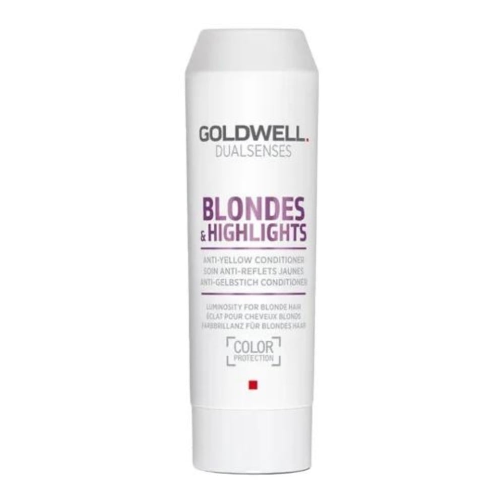Goldwell Dualsenses Blondes & Highlights Anti-Yellow Conditioner conditions bleached hair and neutralizes unwanted yellow tones. The FadeStop formula, combined with the Blonde Chroma Complex, ensures that blonde actually stays blonde! Yellow tones are neutralized, leaving a cool, fresh blonde hair color. But there's more, because not only are yellow tones removed, the Mirbelle Lipid Oil formula prevents color fading and even has a restorative effect!