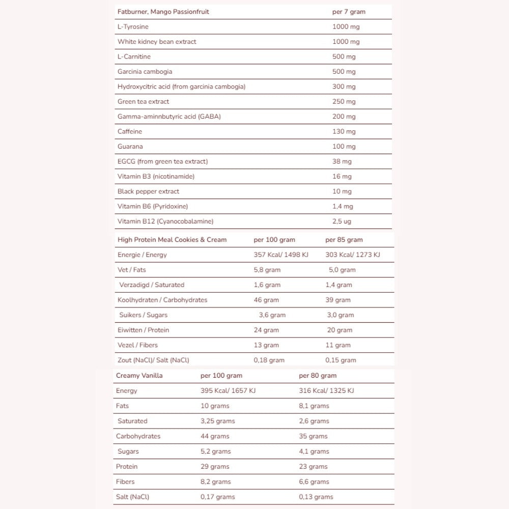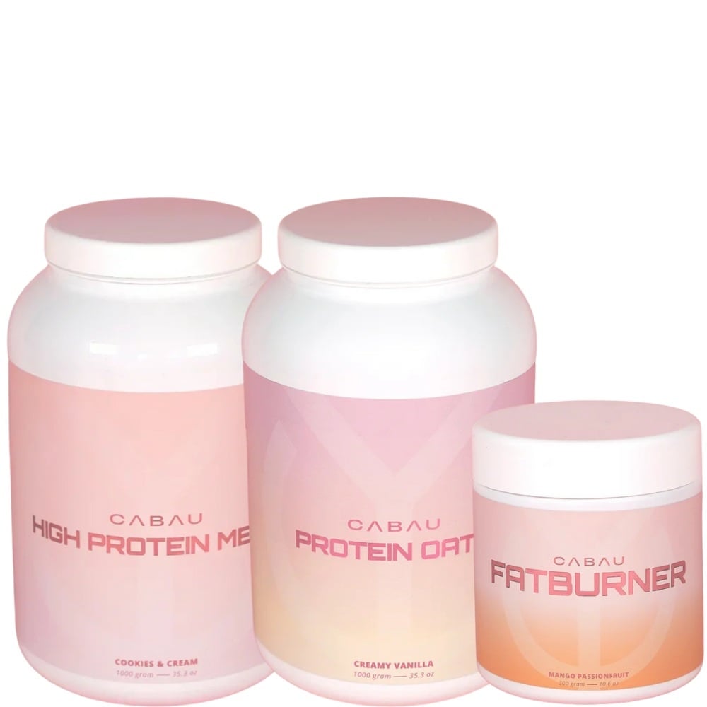 The Cabau Lifestyle Back in Shape Set is your perfect partner to get back into balance. This set contains three carefully selected products: High Protein Meal Cookies & Cream , Protein Oats Creamy Vanilla and Fatburner Mango Passionfruit . Together they support you in achieving your health goals through nutritious meals and an energy boost. Do you want to give your healthy lifestyle an extra boost? Then the Cabau Back in Shape Set is your new buddy!