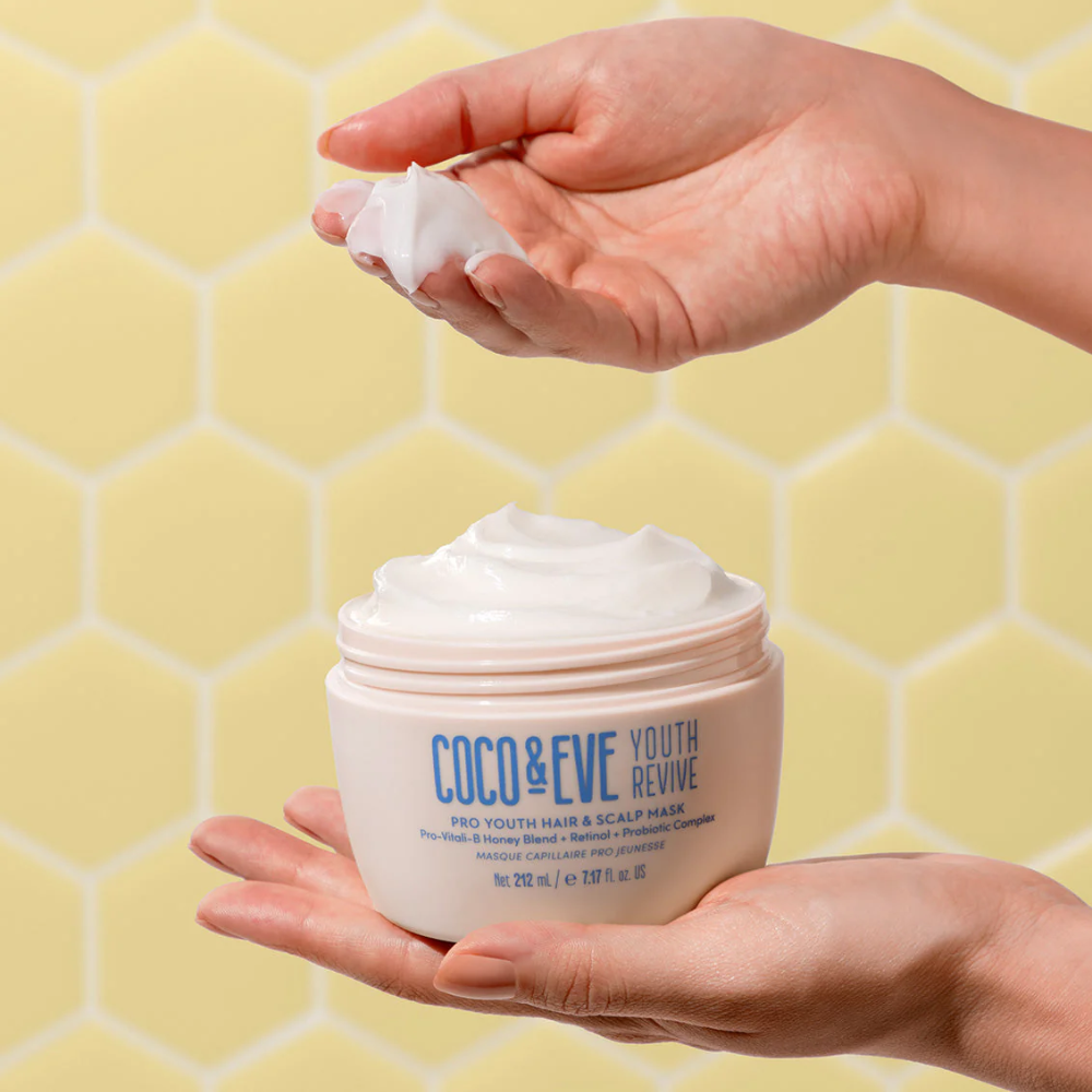 The Coco & Eve Youth Revive Pro Youth Hair & Scalp Mask contains powerful ingredients such as hyaluronic acid for hydration, botanical extracts for repair and antioxidants that soothe and nourish the scalp.
