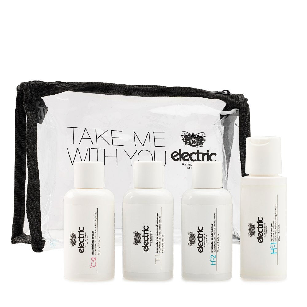 Electric Take Me With You Kit is the must-have for every beauty lover on the go. Whether you're going away for a weekend, cycling to the gym or looking for a stylish gift: this travel-friendly set offers everything your hair needs in mini format. The kit contains four beloved TSA-approved Electric products, perfectly packaged in a transparent zip-up toiletry bag. Compact, practical and luxurious, ready to go anywhere.