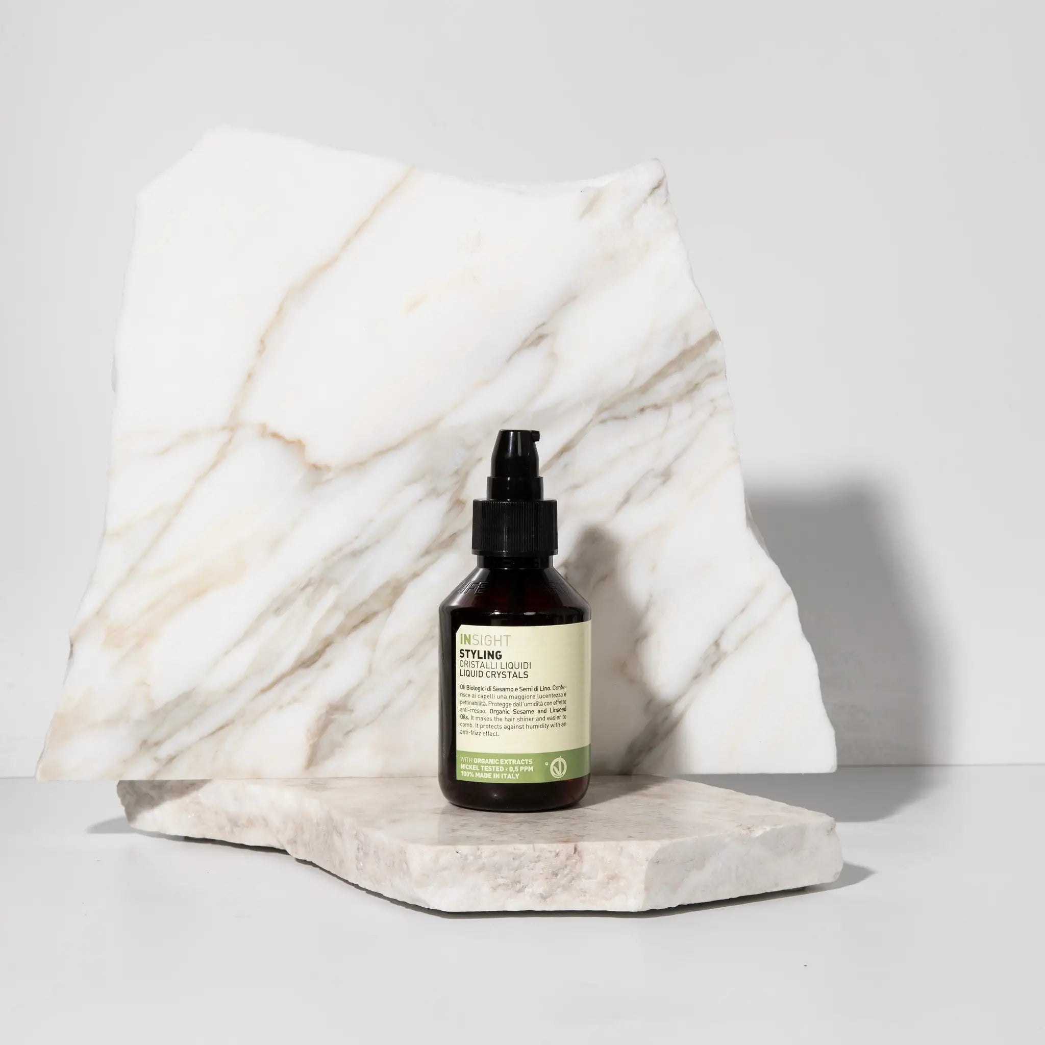 Insight Styling Liquid Crystals is a hydrating serum for dehydrated and damaged hair. The product is ideal for repairing damage and protecting the hair. Insight Liquid Crystals provides hydration and care to all hair types and ensures that the hair remains protected from drying out by the sun or styling tools. After using the serum, the hair shines beautifully again and is more manageable. The product provides clarity and ultimate hydration without weighing down the hair. The serum is enriched with organic sesame and linseed oil. These nourishing ingredients also ensure that the hair becomes less sensitive to moisture, so that it becomes less likely to frizz or lose its shape. Like all other Insight products , this product is provided with organic ingredients and nickel tested. Furthermore, it does not contain SLS, SLES, mineral oils, parabens, silicones, dyes and allergens.