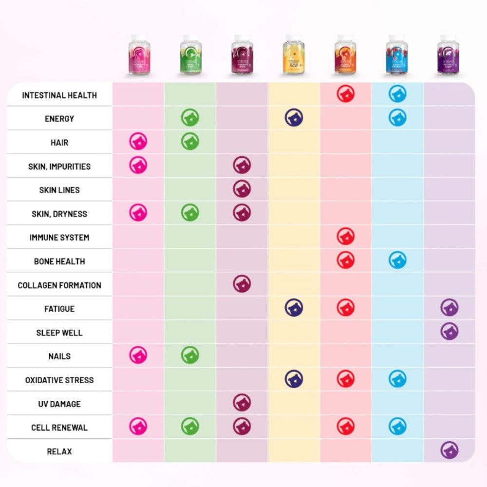 Glucose syrup, sugar, dextrose, gelling agent: pectin, vitamin-mineral mixture (dl-alpha-tocopheryl, ascorbic acid, zinc citrate, retinyl acetate, calcium D-pantothenate, biotin, ergocalciferol, pyridoxine hydrochloride, cyanocobalamin, potassium iodide, folic acid, choline bitarate, inosthiol, maltodextrin), tricalcium phosphate, acidity regulator: citric acid, acidity regulator: tripotassium citrate, natural flavouring, colour (carrot juice concentrate, black carrot juice concentrate), glazing agent: carnauba wax.