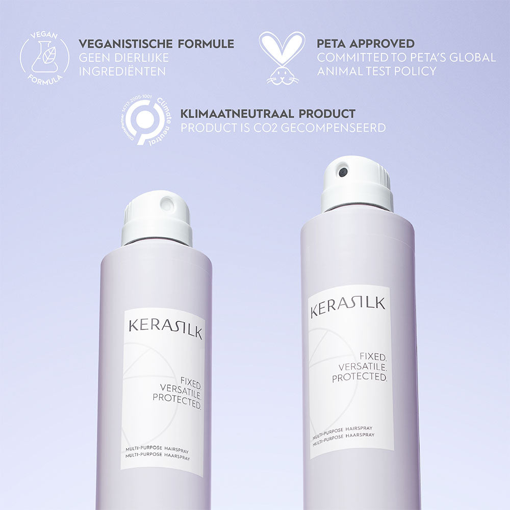 Kerasilk Multi-Purpose Spray is your go-to spray for long-lasting hold without making your hair hard! This versatile hairspray gives your hair look long-lasting hold and protection against humidity, so your look stays in place all day/evening! Thanks to the light formula, the spray gives your hair a natural shine without a sticky or heavy feeling. And the Multi-Purpose Spray is (even more) suitable for everyone, thanks to the 100% vegan and silicone-free formula!