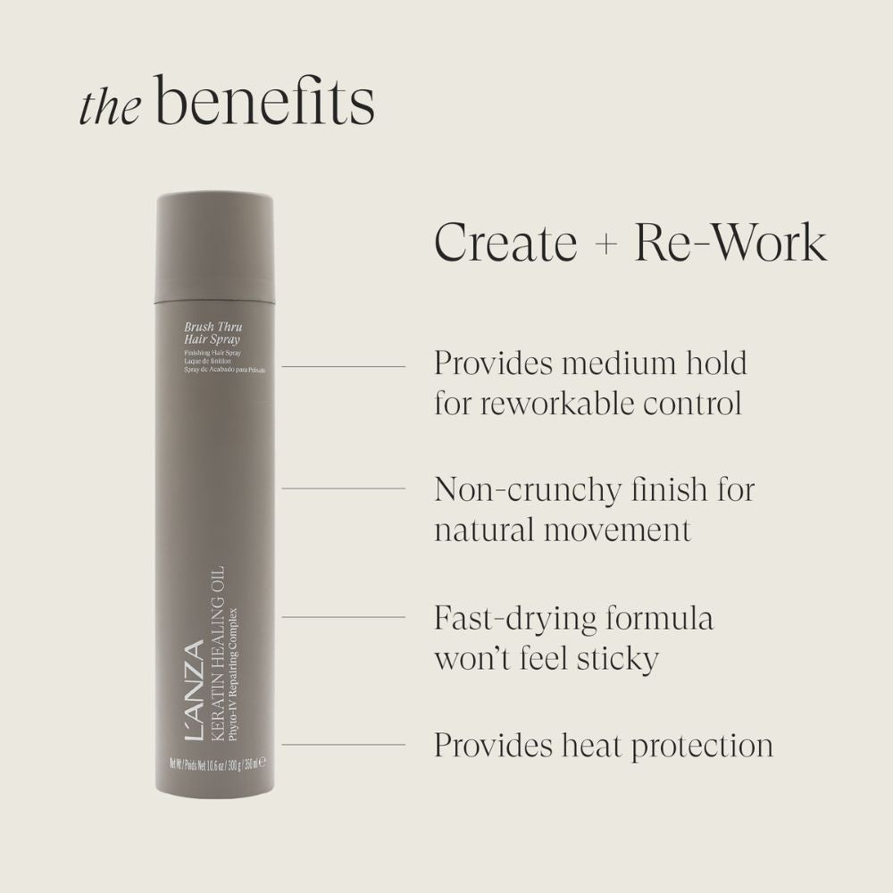 The Brush Thru Hair Spray keeps your hair in place with a medium hold that lasts all day. Your hair will have a beautiful shine, feel silky-soft, and stay frizz-free without sacrificing volume or movement.