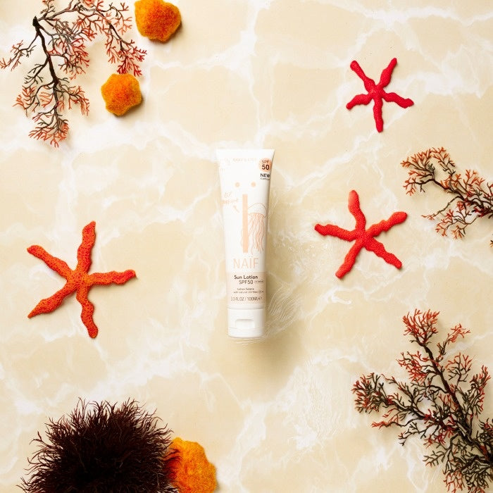 Naïf Baby & Kids Sun Lotion SPF50 is perfect to protect your child's skin when the sun shines. This fine lotion without exposure time and without perfume ensures minimal risk of skin irritation. Extra suitable for sensitive baby skin! The sunscreen lotion has a natural filter made from the mineral zinc oxide (non-nano), which forms a layer on the skin. This immediately reflects the sun's rays. The lotion contains water compared to a cream, which ensures that it spreads easily and absorbs quickly. In addition, it is of course also water resistant! :)