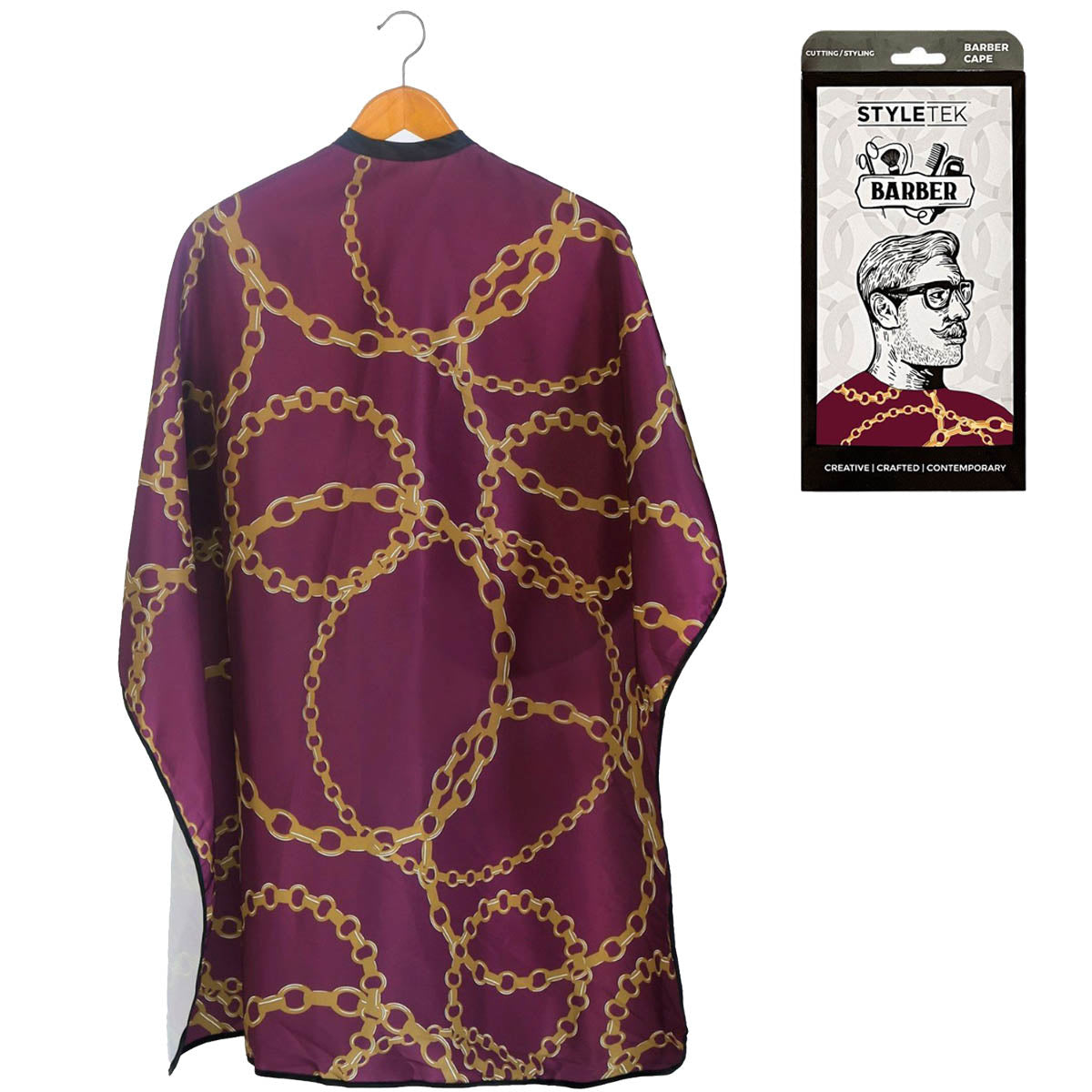 Styletek Paint/Cape Chain It Up of very high salon quality with handy button closure. Suitable for cutting, dyeing and perming and is very popular with barbers with this print. Furthermore, the cape is washable up to 30 degrees. After washing, it is advisable to hang the cape out and dry on a clothes hook. This prevents wrinkles. The cape is made of 100% polyester and is antistatic and breathable, which is pleasant for the customer.