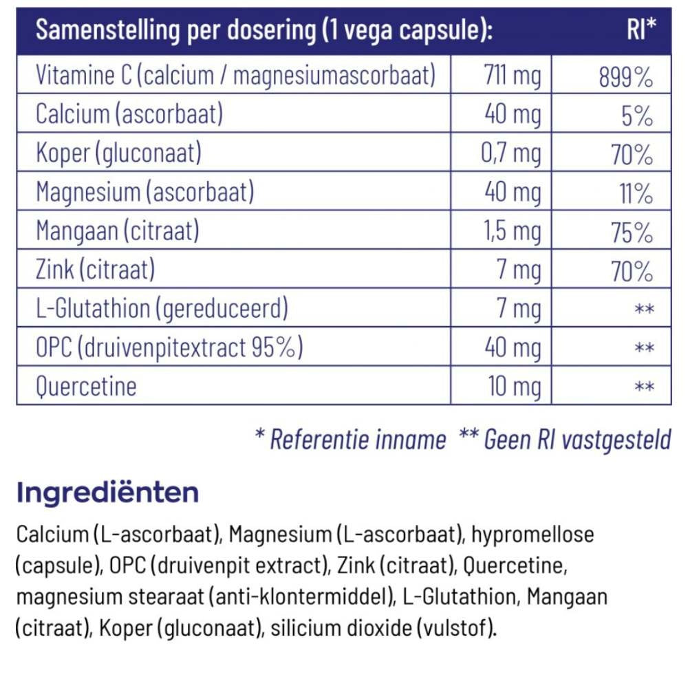 Calcium (L-ascorbate), Magnesium (L-ascorbate), hypromellose (capsule), OPC (grape seed extract), Zinc (citrate), Quercetin, magnesium stearate (anti-caking agent), L-Glutathione, Manganese (citrate), Copper (gluconate), silicon dioxide (bulking agent).