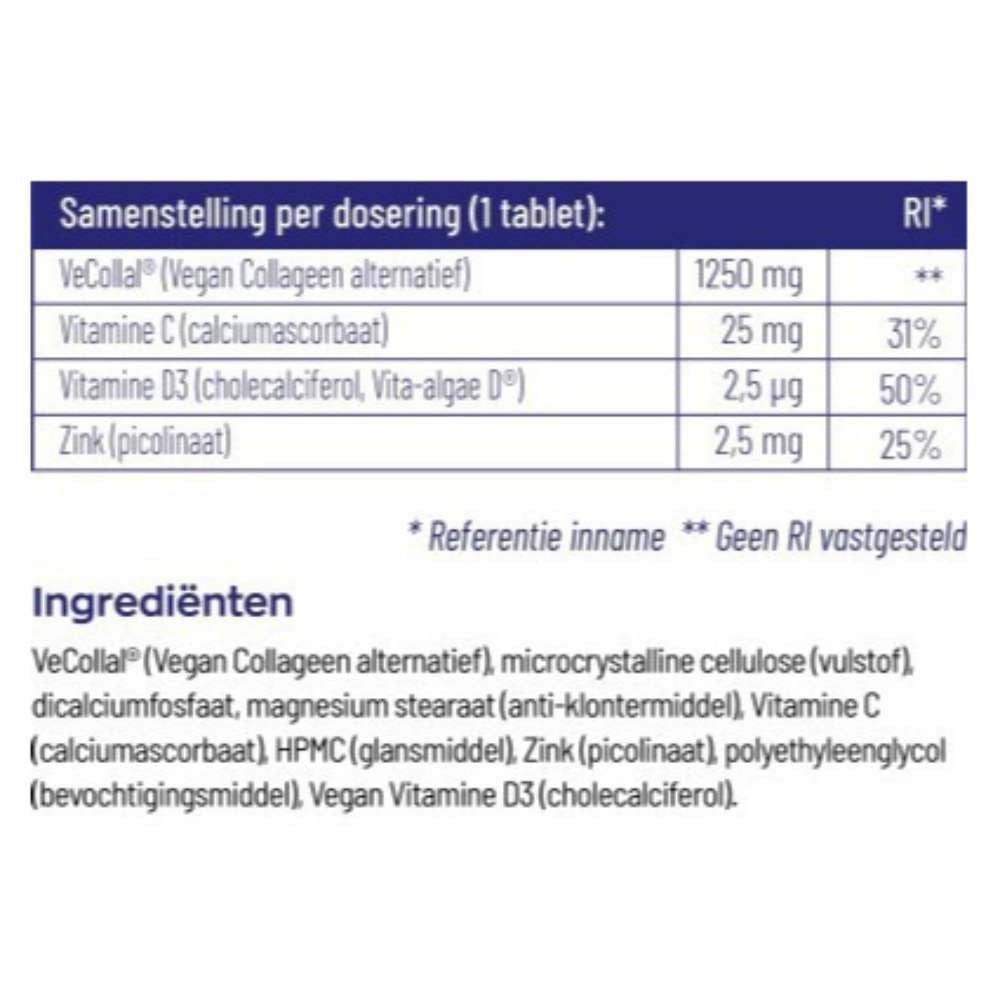 VeCollal® (Vegan Collagen alternative), microcrystalline cellulose (bulking agent), dicalcium phosphate, magnesium stearate (anti-caking agent), Vitamin C (calcium ascorbate), HPMC (glazing agent), Zinc (picolinate), polyethylene glycol (humectant), Vegan Vitamin D3 (cholecalciferol).