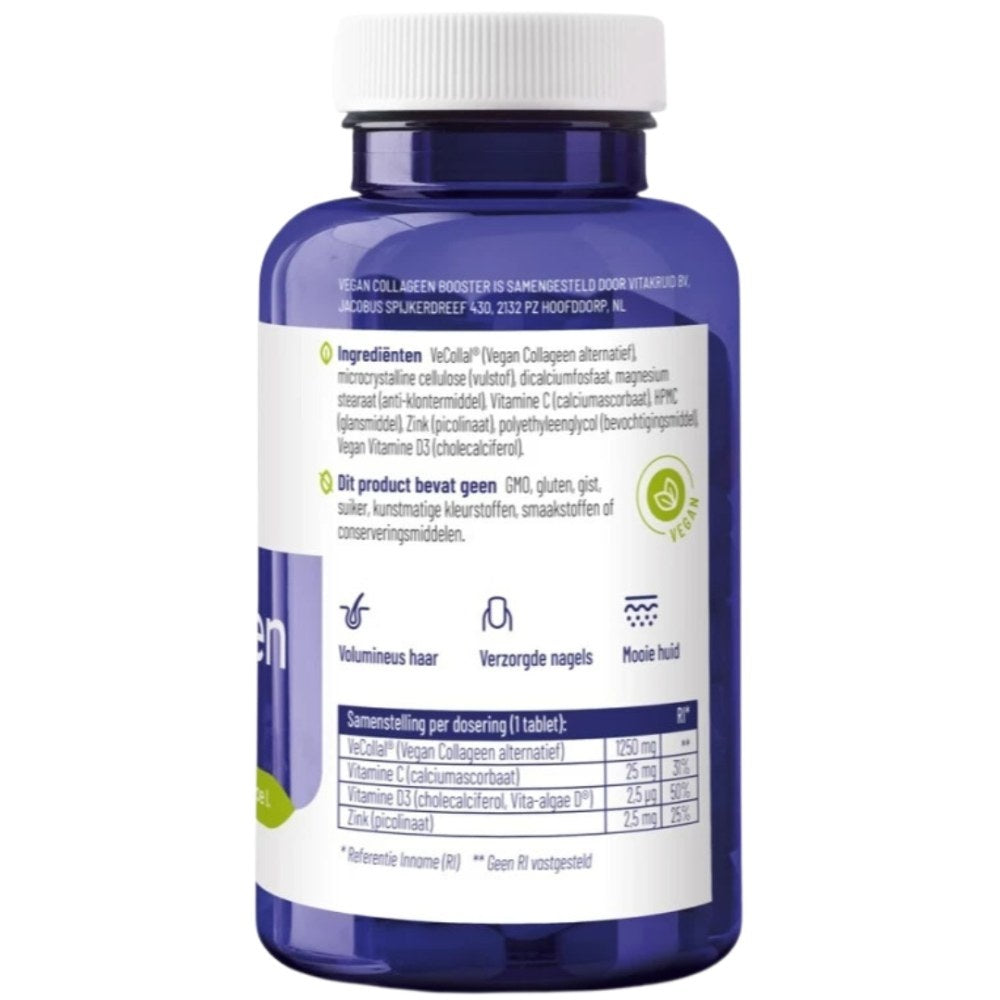 Collagen is primarily obtained through animal products. If you don't consume animal products, you may not get enough collagen. It's possible to get the right amino acids for collagen through plant-based products, but this can be quite a challenge because it requires a very varied diet. For this group of people, getting vitamin D and zinc can also be quite difficult. Plant-based products contain relatively less of these nutrients than animal products. Fortunately, all these nutrients are found in Vitakruid 's Vegan Collagen Booster , so you can boost your collagen, especially if you follow a vegan lifestyle!