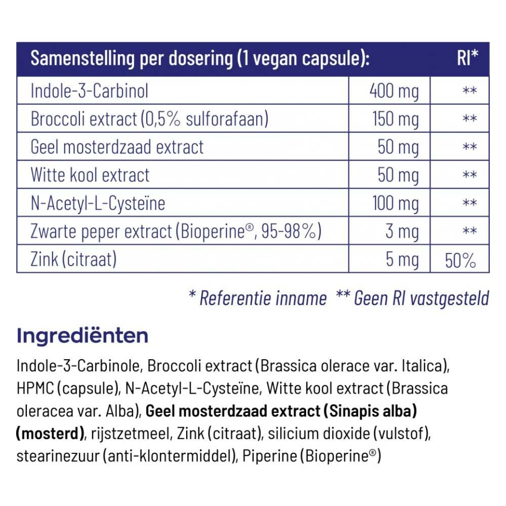 Broccoli germ extract (Brassica olerace var. Italica) (HiActives®), White cabbage extract (Brassica oleracea var. Alba), Yellow mustard seed extract (Sinapis alba) (mustard), HPMC (capsule), rice starch, Zinc (citrate), silicon dioxide (bulking agent), stearic acid (anti-caking agent), Piperine (Bioperine®).