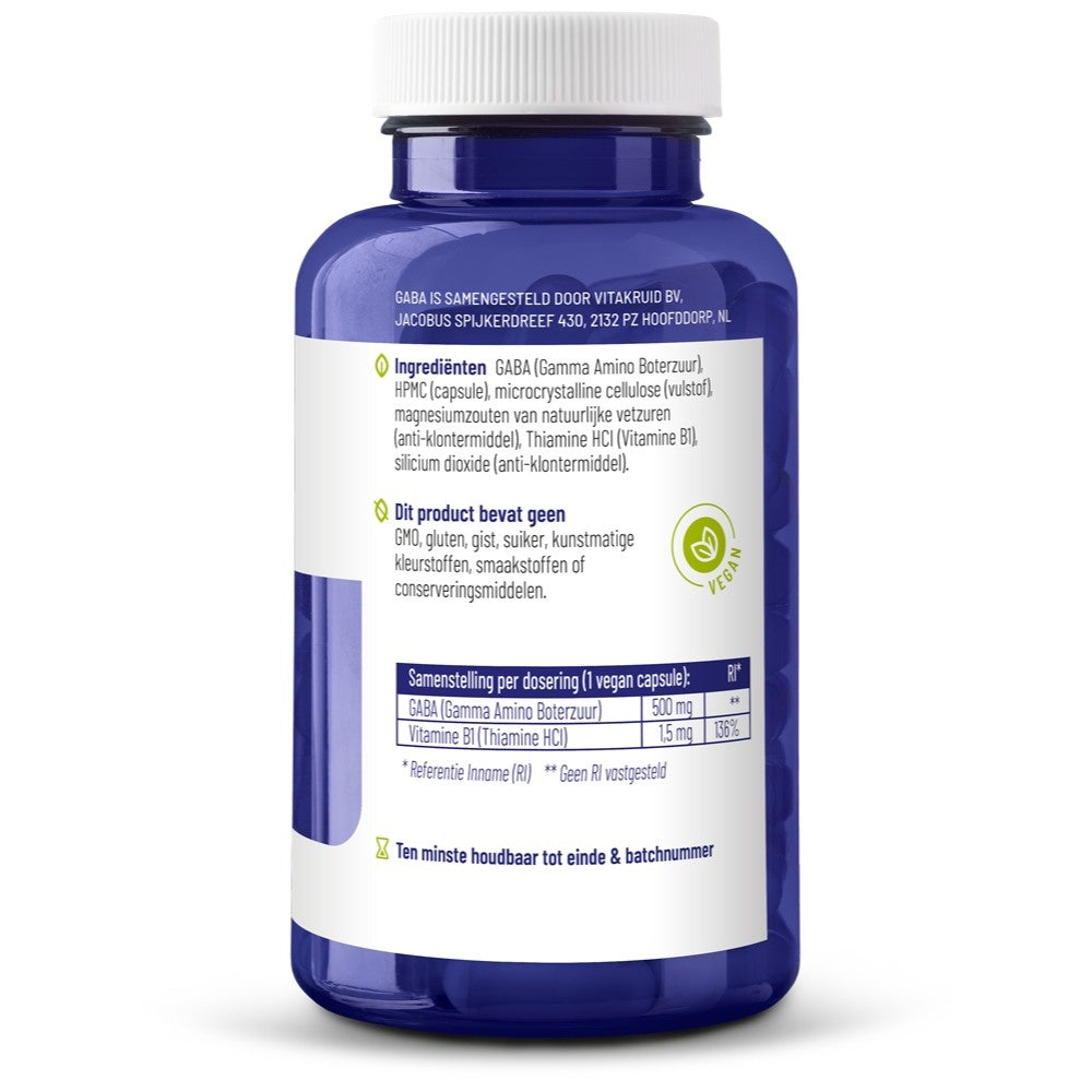 GABA is formed from the amino acid L-glutamine. Proteins from your diet are also converted into L-glutamine. For this conversion process, your body needs cofactors such as minerals, vitamins, and other substances. Vitamin B1 is necessary for this conversion process, which is why Vitakruid 's GABA formula contains 1.5mg of vitamin B1. Vitamin B1 is also beneficial for mood. The vitamin B1 is, of course, added in the easily absorbable form: Thiamine HCL. For GABA, we chose to use 500mg of pure, absorbable GABA.