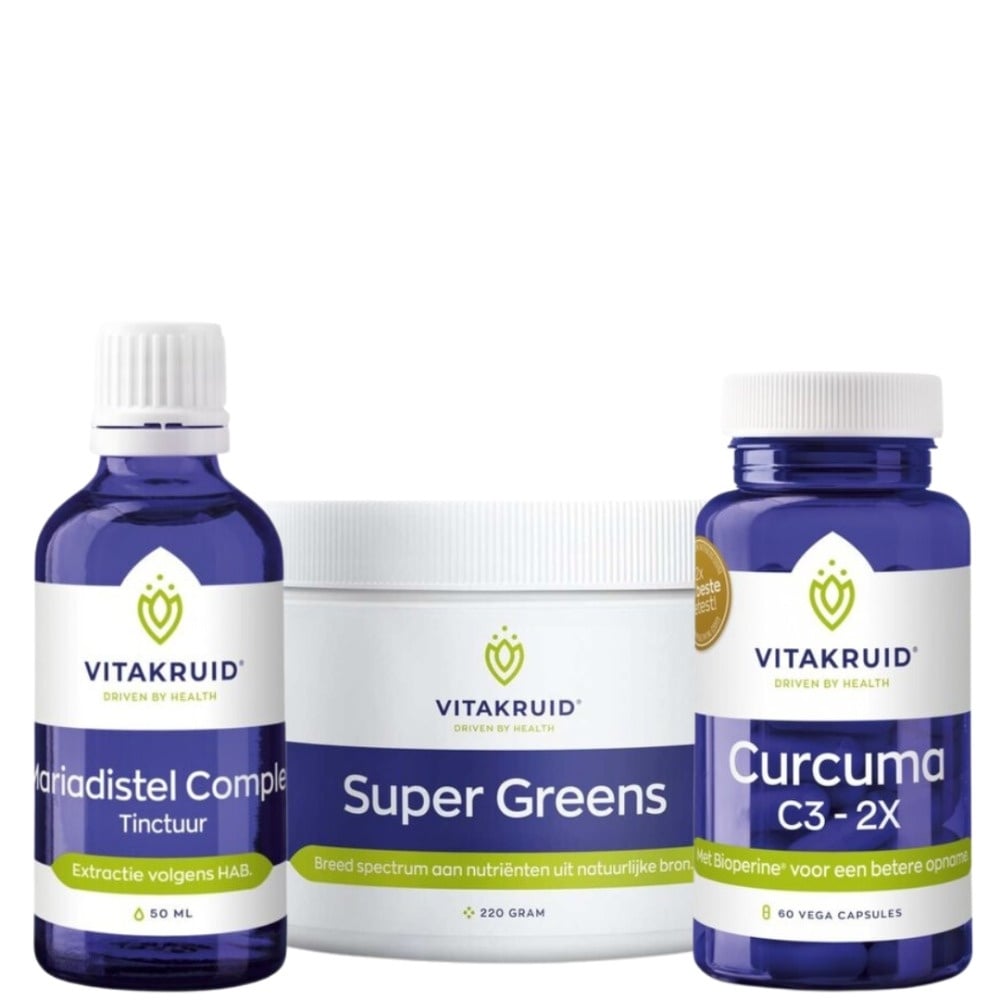 The Vitakruid Liver Detox Bundle supports liver health. You might not immediately think about liver health, but our livers endure a lot every day. A poor routine, unhealthy diet, or even that one party can all directly impact liver health. To support your liver, the Milk Thistle Complex is recommended. The three herbs in this formula work perfectly together and complement each other where needed. In addition, Super Greens also supports bile and kidney function. Curcuma C3-2X acts as an antioxidant and promotes digestion. Everything you need to support your liver, all at once, thanks to this convenient and affordable bundle!
