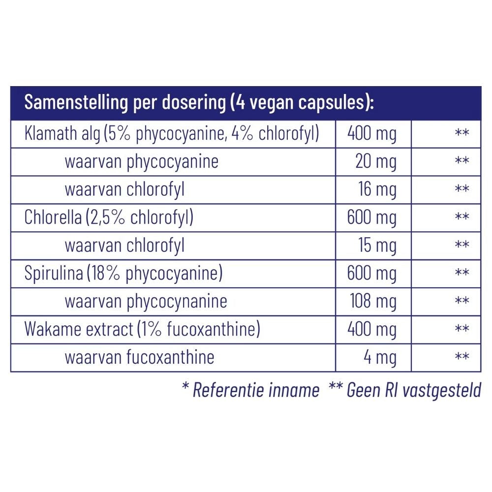 High standardization Klamath (5% phycocyanin, 4% chlorophyll), Chlorella (2.5% chlorophyll), Spirulina (18% phycocyanin) & Wakame (1% fucoxanthin)