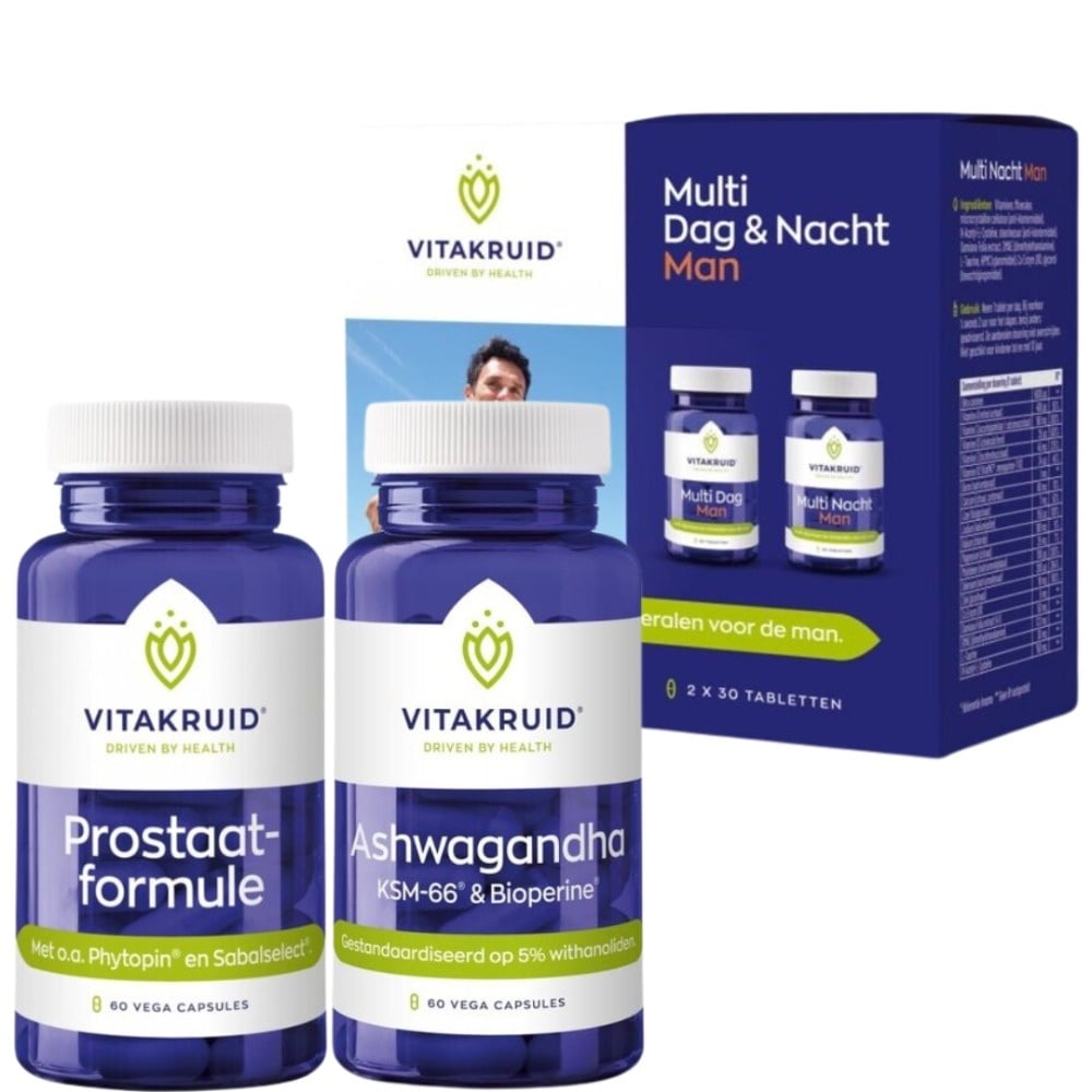 The Vitakruid Prostate, Fertility, and Sexuality Bundle is the ultimate bundle for supporting the key aspects of a man's life. Prostate health, fertility, and sexuality are crucial aspects of life. Naturally, we want to provide these areas with the support they need. That's why Vitakruid has created a bundle with three nutritional supplements that help support these pillars and promote health. First and foremost, of course, is the prostate formula; this Vitakruid formula is the best prostate product in the Netherlands! The complete product consists of a scientifically proven blend of vitamins, minerals, amino acids, and SabalSelect saw palmetto. Among other things, the formula helps with regular urination. Ashwagandha supports male potency, and the multivitamin has several health benefits specifically tailored to men's needs. Give your health (and masculinity) a boost!