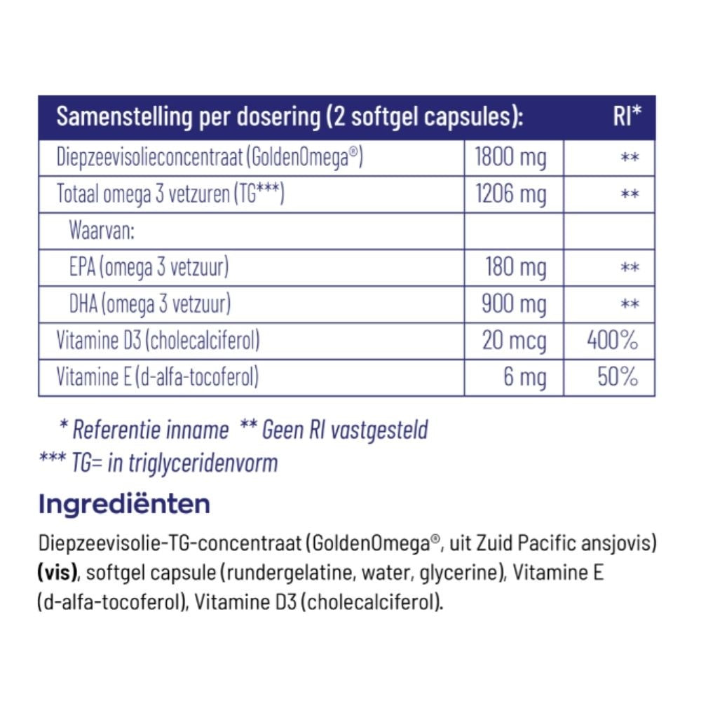 Ingredients: Deep-sea fish oil concentrate (GoldenOmega®, from South Pacific anchovy) (fish), softgel capsule (bovine gelatin, water, glycerin), Vitamin E (d-alpha-tocopherol), Vitamin D3 (cholecalciferol).