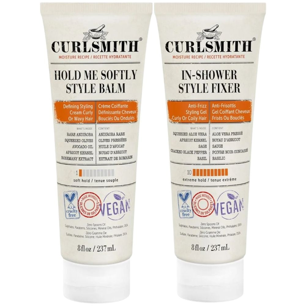 Curlsmith Hold & Define Styling Set is jouw stylingduo voor krullen die zowel zacht aanvoelen als perfect gedefinieerd blijven. De Hold Me Softly Style Balm geeft een lichte, natuurlijke hold en zorgt voor zachte, pluisvrije lokken, terwijl de Curl Defining Soufflé Gel extra definitie en glans toevoegt met een flexibele, langdurige hold. Samen vormen ze dé routine voor een look die de hele dag mooi blijft, zonder dat je krullen crunchy of zwaar aanvoelen. Beide producten zijn Curly Girl Approved, vegan en vrij van sulfaten, siliconen en uitdrogende alcohol.