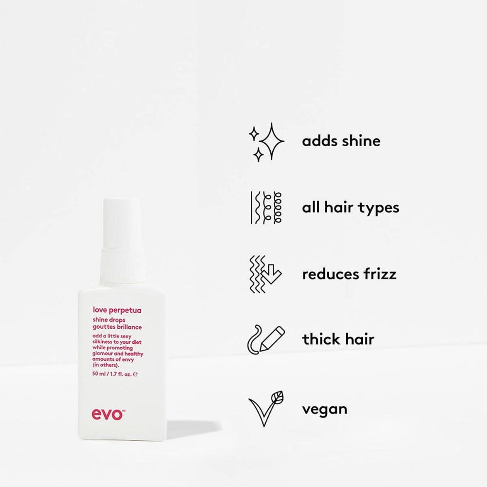 De EVO Love Perpetua Shine Drops maken je haar glad, glanzend en pluisvrij, met langdurige bescherming tegen vocht en een luxueuze, gepolijste look.
