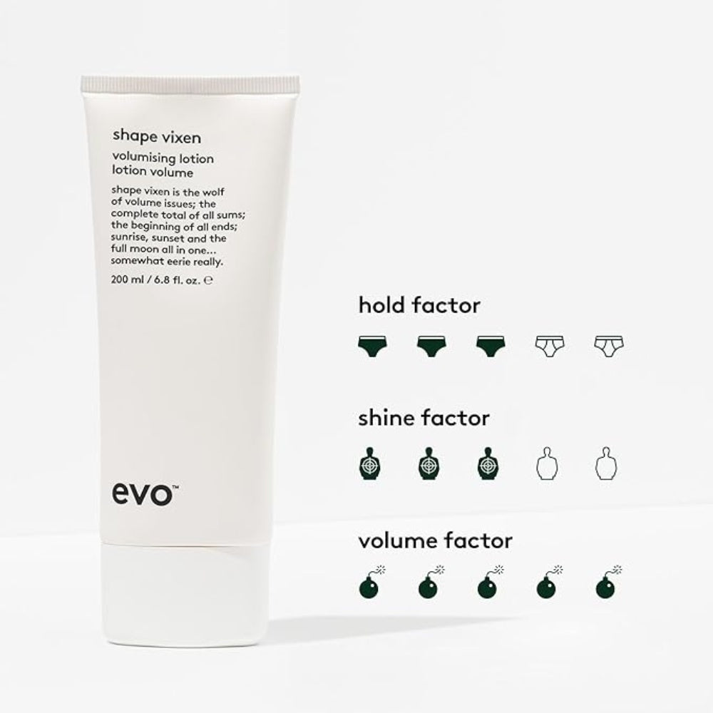 De EVO Shape Vixen Volumising Lotion is een lichte vegan volumelotion die fijn en futloos haar een blijvende boost geeft. Deze Evo Volume stylinglotion zorgt voor langdurige body, vorm en stijlondersteuning, zonder je haar stug of zwaar te maken. Met hydrolyzed quinoa voor kracht en kleurbehoud én een luchtige, aanraakbare finish, is dit de perfecte basis voor volumineuze kapsels die de hele dag mooi blijven.