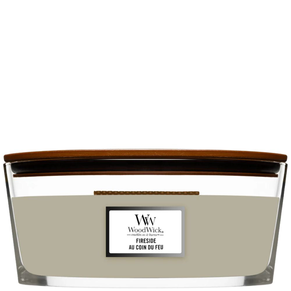 De Woodwick Fireside Ellipse Candle maakt je huis warm, intiem en heerlijk uitnodigend, alsof je voor een knetterend haardvuur zit.