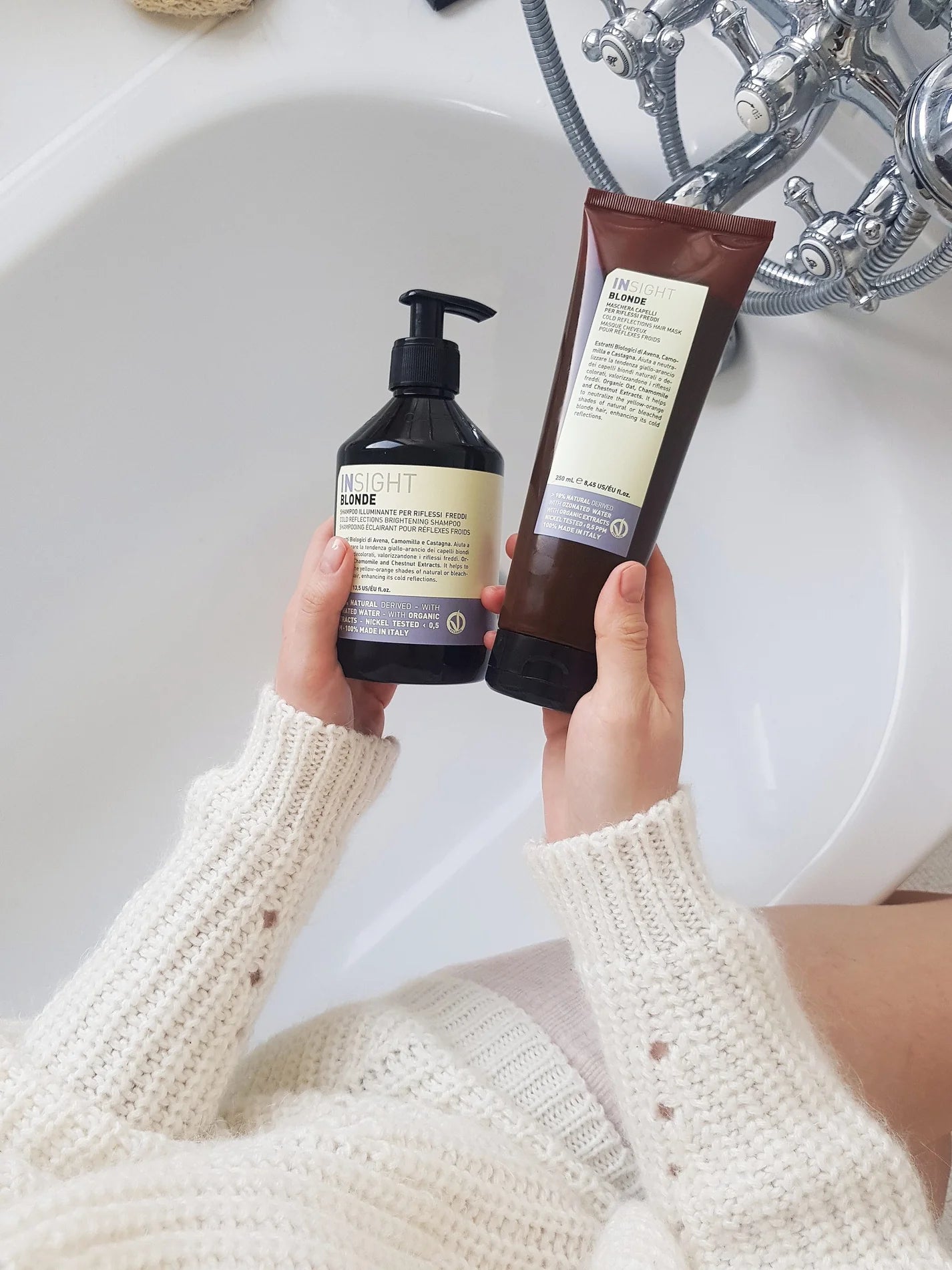 De producten uit de Insight Blonde Set werken hand in hand samen en versterken elkaars werking. Begin met het wassen van je haar met de shampoo. Masseer de shampoo goed in zodat het gaat schuimen. Laat de shampoo 3 minuten inwerken om de warme tinten te elimineren. Heb je last van veel warme tinten? Laat het dan langer inwerken. Vervolgens gebruik je het haarmasker om het haar extra hydratatie en verzorging te bieden. Laat het haarmasker 5 tot 10 minuten inwerken. Hoe langer je het haarmasker laat inwerken, hoe intensiever de werking.