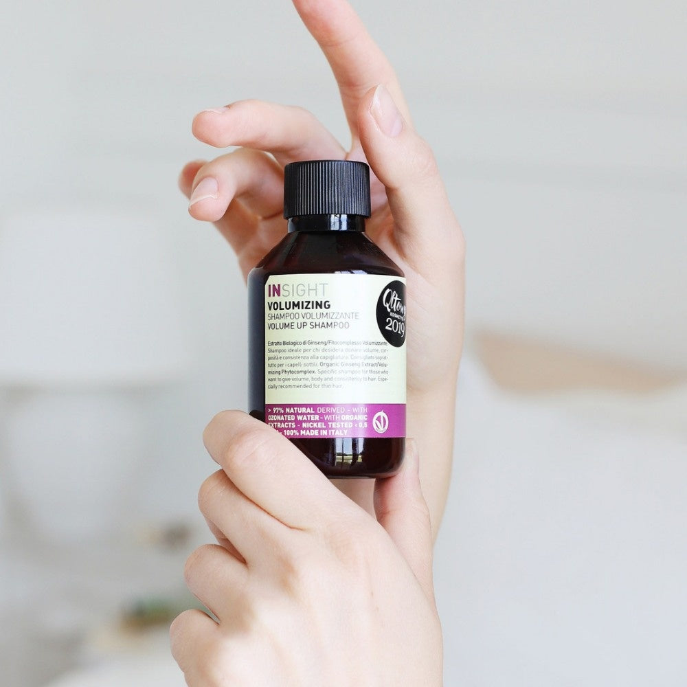 Insight Volume Up Shampoo Travelsize is travelsize shampoo van een lijn die speciaal is ontwikkeld voor fijn en zacht haar. Insight Volume Up Shampoo zorgt ervoor dat je haar meer body krijgt zodat je dunne haren er niet futloos uit gaan zien. De shampoo geeft volume van het begin van je haar tot de punten. Het is een vegan shampoo. Ook is de shampoo nikkel getest. De shampoo bevat Organic Ginseng Extract, Organic Psyllium Extract en Organic White Nettle Extract. Een shampoo die je haar voller laat lijken, wie wilt dat nou niet!