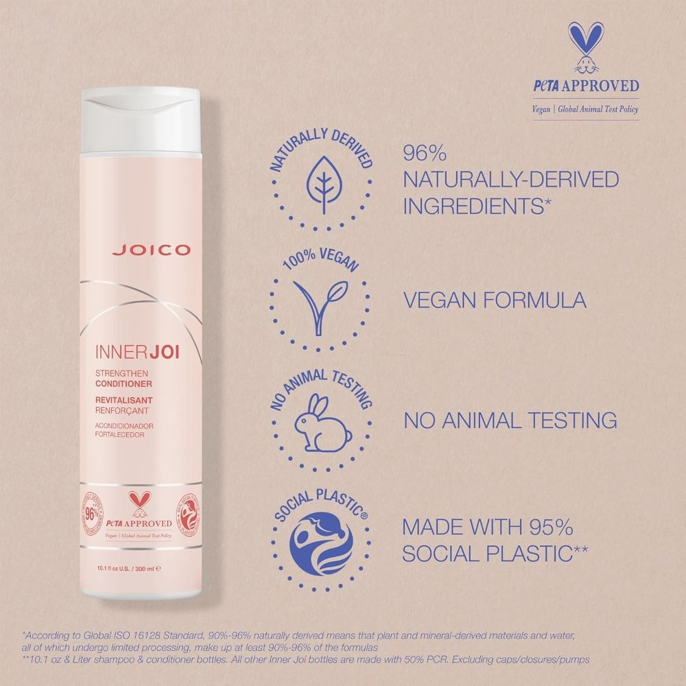De Joico Innerjoi Strengthen Conditioner is geformuleerd met een mix van hoogwaardige ingrediënten die zorgen voor optimale versterking, hydratatie en herstel.