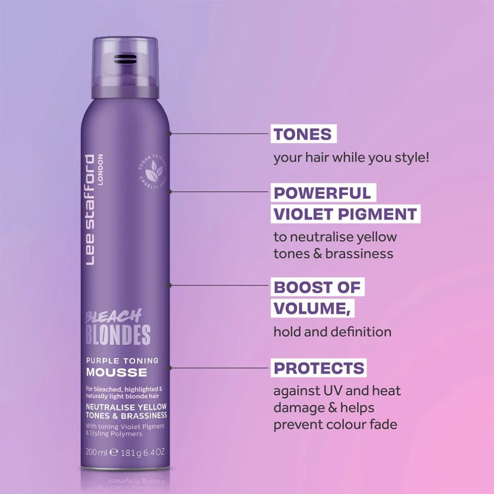 De Lee Stafford Bleach Blondes Purple Toning Mousse is jouw nieuwe go-to product voor prachtig koel blond haar zonder gele tonen! Deze volume mousse is speciaal ontworpen voor geblondeerd, natuurlijk blond of grijs haar, en helpt je om ongewenste warmte in je haarkleur te neutraliseren. Dankzij de paarse pigmenten krijg je een frisse, koele blonde tint en een volle, luchtige styling met een zachte hold. Ideaal voor blondines en grijs haar dat wel wat extra liefde en glans kan gebruiken!