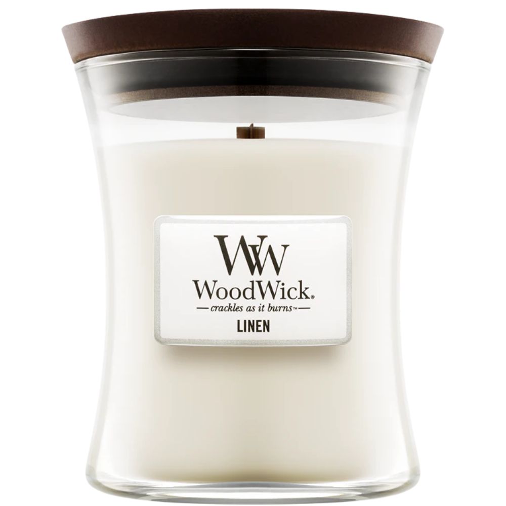 • De WoodWick Linen Medium Candle is een ideaal formaat voor slaapkamer, werkkamer of badkamer