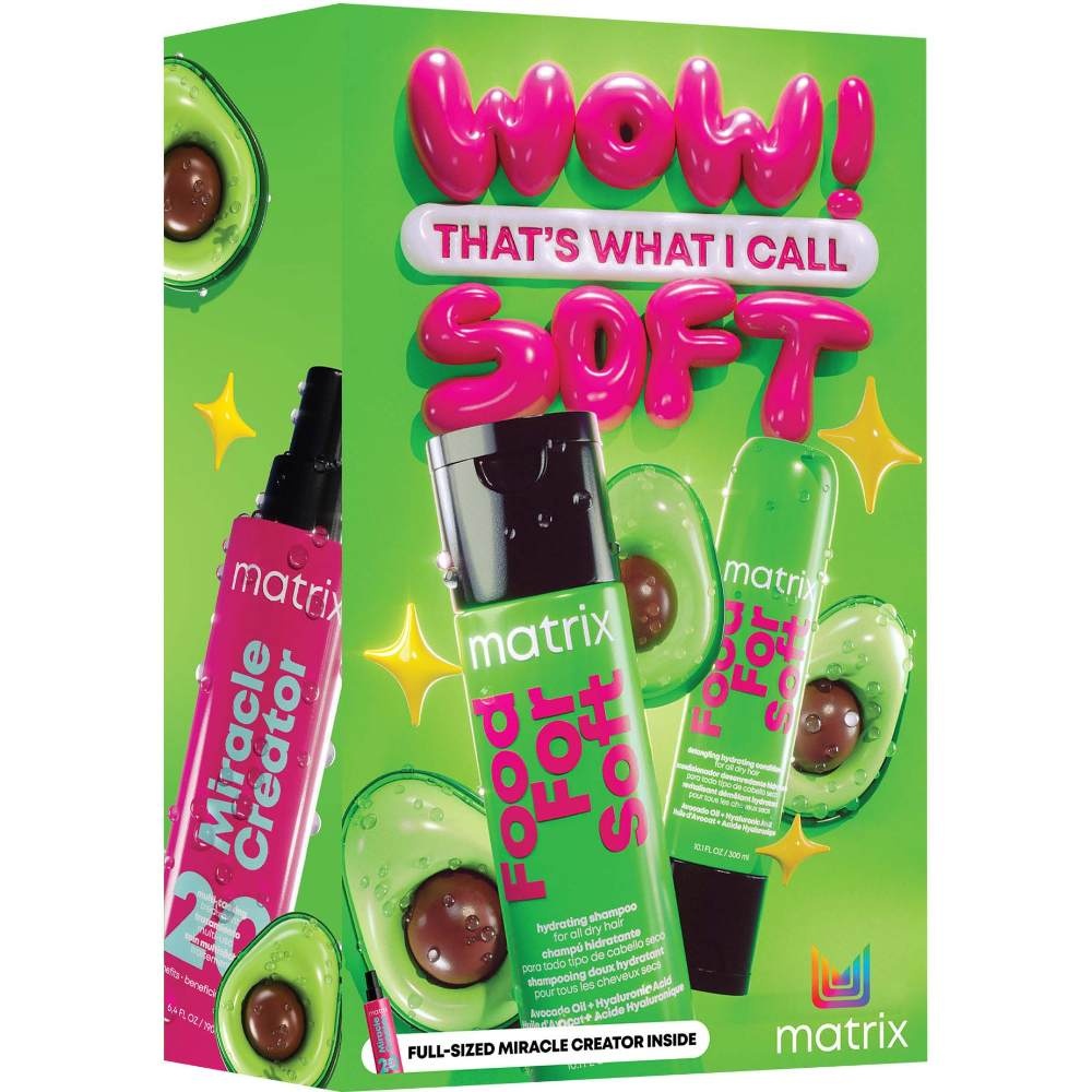 De Matrix Food For Soft Holiday Dream Hair Gift Set zorgt voor mega zacht dream hair! Droog haar wordt intens gevoed dankzij de rijke formules met avocado-olie en hyaluronzuur. Overtollig vet en onzuiverheden worden verwijderd zodat jouw haar weer lekker fris is. Na het wassen van je haar geef je het haar een extra verzorgende boost met de populaire Miracle Creator Leave-in Spray die pluizen vermindert, beschadigd haar repareert en je haar beschermd tegen negatieve invloeden van buitenaf. Healthy Hair gegarandeerd! De Holiday Set bestaat uit: