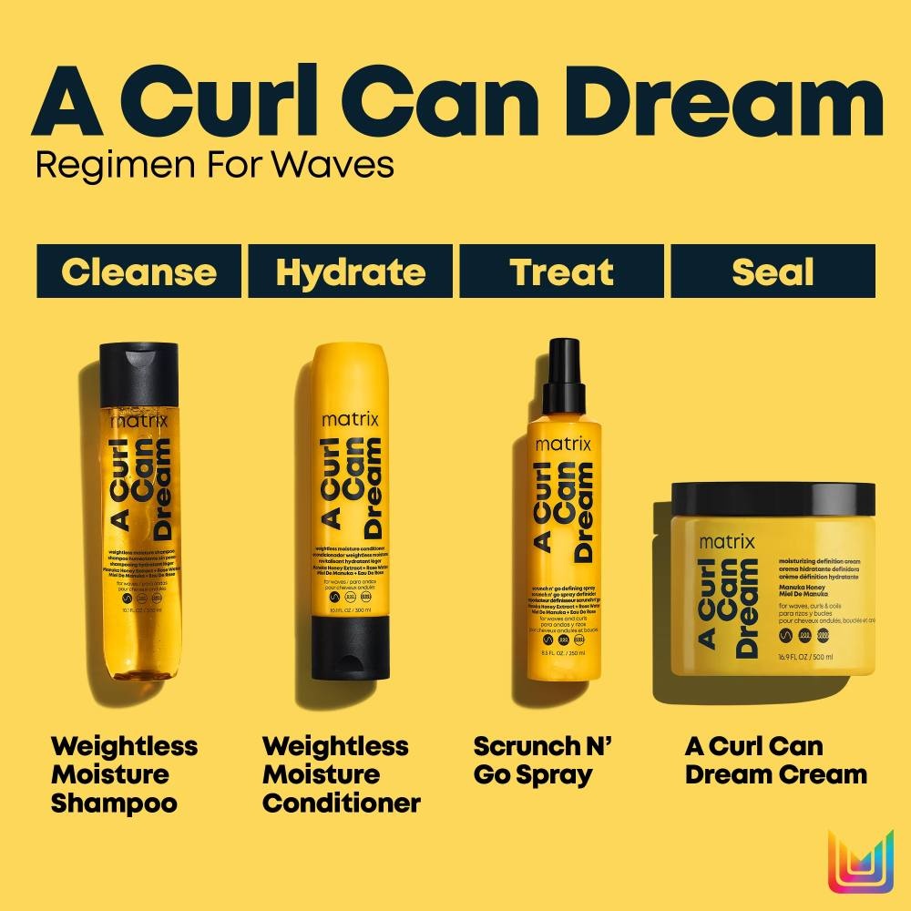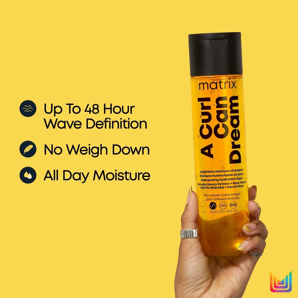 Matrix A Curl Can Dream Wavy Duo is speciaal ontwikkeld voor golvend haar. Dankzij de verzorgende formules van zowel de shampoo als de conditioner krijgen je lokken tot wel 48 uur meer definitie. Dit is te danken aan de natuurlijke ingrediënten zoals Manuka Honing Extract en Rozenwater. Deze natuurlijke ingrediënten voeden het haar van binnenuit en geven je golven meer definitie zonder dat ze het haar verzwaren. Zo behoud je optimaal volume terwijl je het haar tegelijkertijd de hydratatie geeft die het nodig heeft. Je golven zien er glanzend en veerkrachtig uit. Niet alleen heb je dankzij deze haarverzorgingsset sowieso een good hair day, de shampoo en conditioner hebben ook nog eens een heerlijke geur van zoete roos, pioenroos en warm amber.