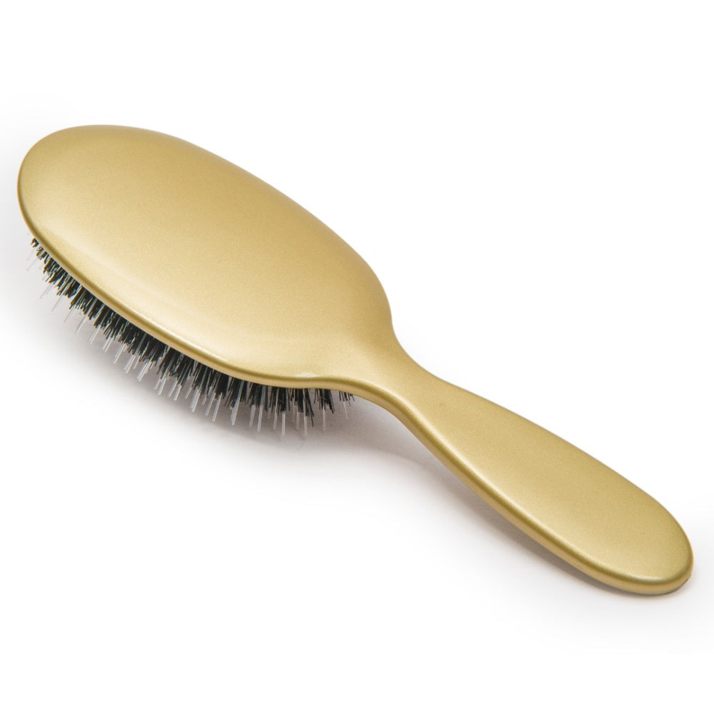 Deze borstel is gemaakt van hoogwaardige materialen: stevige kunststof voor een duurzame basis en natuurlijke zwijnenharen die je haar verzorgen. De gouden afwerking maakt de borstel extra bijzonder. Raadpleeg altijd de verpakking voor meer details over de materialen.