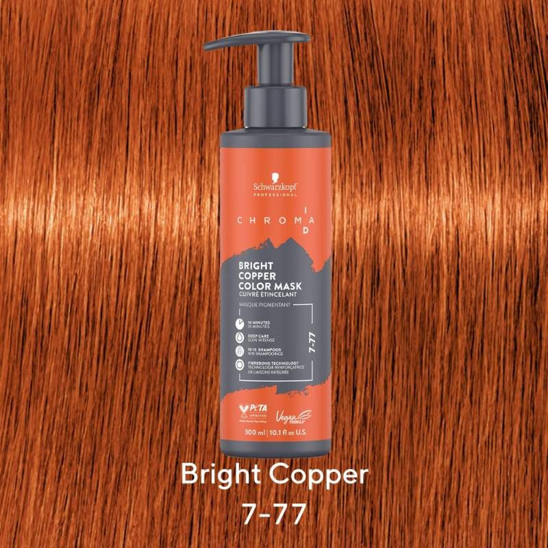 Schwarzkopf Chroma ID Bonding Color Mask Bright Copper (7-77), het allereerste 100% toepasbare,semi-permanente mix- en tone kleursysteem! Dat niet alleen, naast het feit dat je er onwijs veel kleuren mee kan creëren worden de haren tegelijk verzorgt en versterkt dankzij de Bonding Technology. Je kan de meeste natuurlijke blonde  kleur creëren tot extreem rose, je opties zijn eindeloos! One size fits all is absoluut verleden tijd, het is nu  tijd dat jij, de ware artiest volledig op kan gaan in je waanzinnige creaties! Chroma ID is een tijdelijke kleuring die je gewoon zelf thuis kunt gebruiken om je haarkleur te behouden, of te transformeren, zonder schade aan te richten of haarbreuk te  veroorzaken.