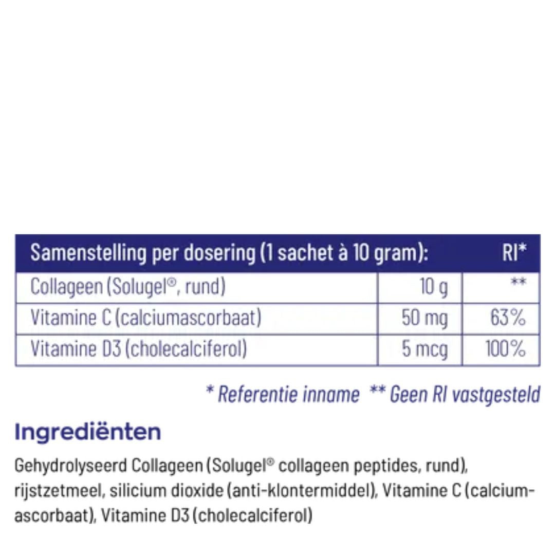Gehydrolyseerd Collageen (Solugel® collageen peptides, rund), rijstzetmeel, silicium dioxide (anti-klontermiddel), Vitamine C (calciumascorbaat), Vitamine D3 (cholecalciferol).