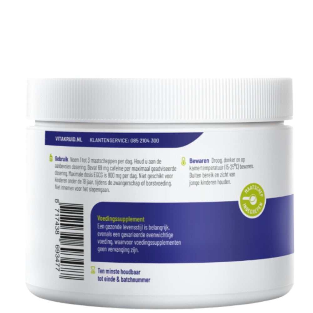 Goed om te weten: De bijgeleverde maatschep staat gelijk aan 1 gram. De Vitakruid Matchapoeder bevat 23 mg per gram. De maximale dosis EGCG per dag is 800mg.