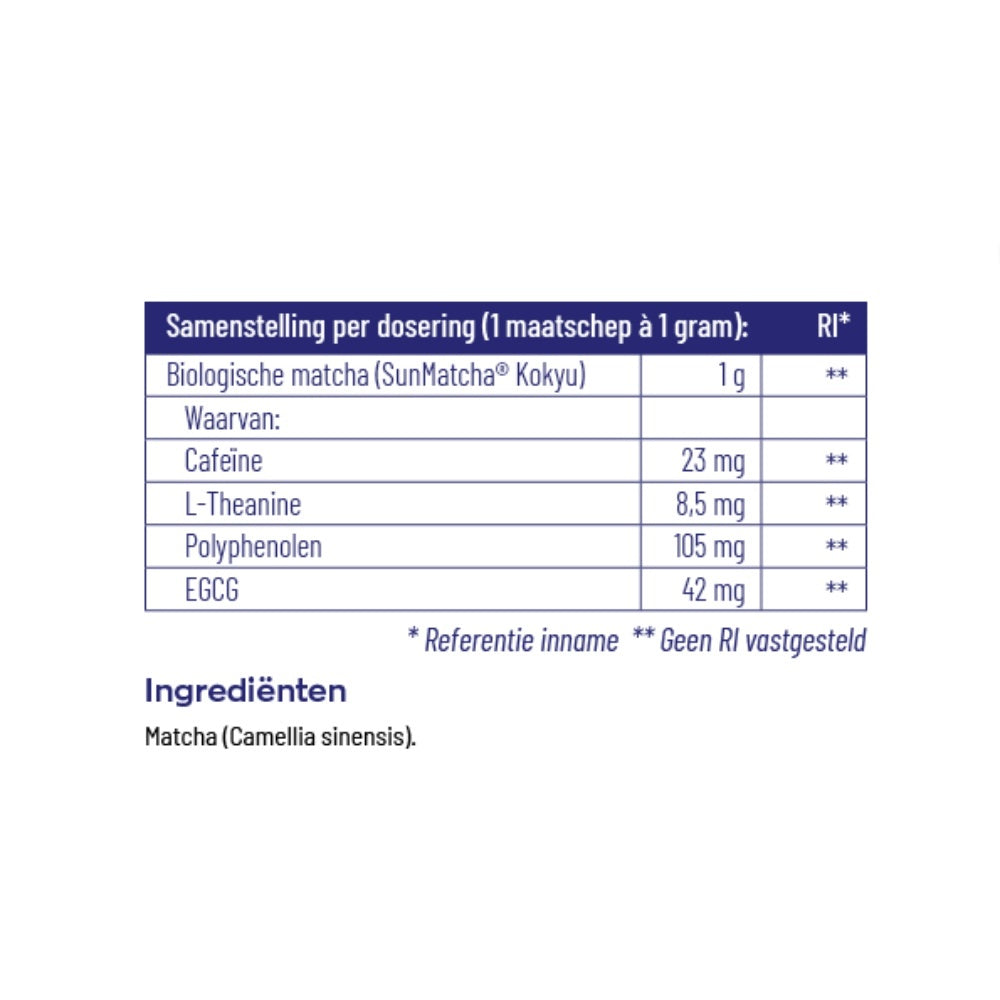 100% SunMatcha® Kokyu poeder, zonder toevoegingen, suikers of kunstmatige stoffen.