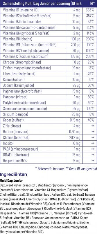 De Multi Dag Junior bevat alleen vitaminen in de meest biologische beschikbare vorm. Dit zorgt voor een goede opname van de verschillende nutriënten en de hoogste kwaliteit. Al deze nutriënten zijn in een hoge en veilige dosering toegevoegd aan het supplement. Zo wordt er gebruik gemaakt van vitamine B6 in de veiligste vorm, P-5-P. Er zijn tot op heden geen bijwerkingen geconstateerd van deze actieve vorm, dit is de meest veilige keuze voor jouw kind. Hesperidine is ook bekend onder vitamine P en is te vinden in het zachte witte deel onder de citrusvrucht. Tijdens het koken verdwijnt deze vitamine voor 70% tot 90% uit onze voeding. Een ander toegevoegd mineraal is Silicium, wat een positief effect heeft op huid, haar en nagels. Silicium is toegevoegd in de vorm van een hoogwaardig, natuurlijk bamboe-extract. Quatrefolic is een vorm van foliumzuur met de hoogste biologische beschikbaarheid in tegenstelling tot synthetische vormen. Doordat Quatrefolic al is omgezet tot de vorm 5-MTHF heeft het lichaam geen hulpnutriënten nodig voor het omzetten van het foliumzuur en kan het optimaal profiteren van de voordelen.